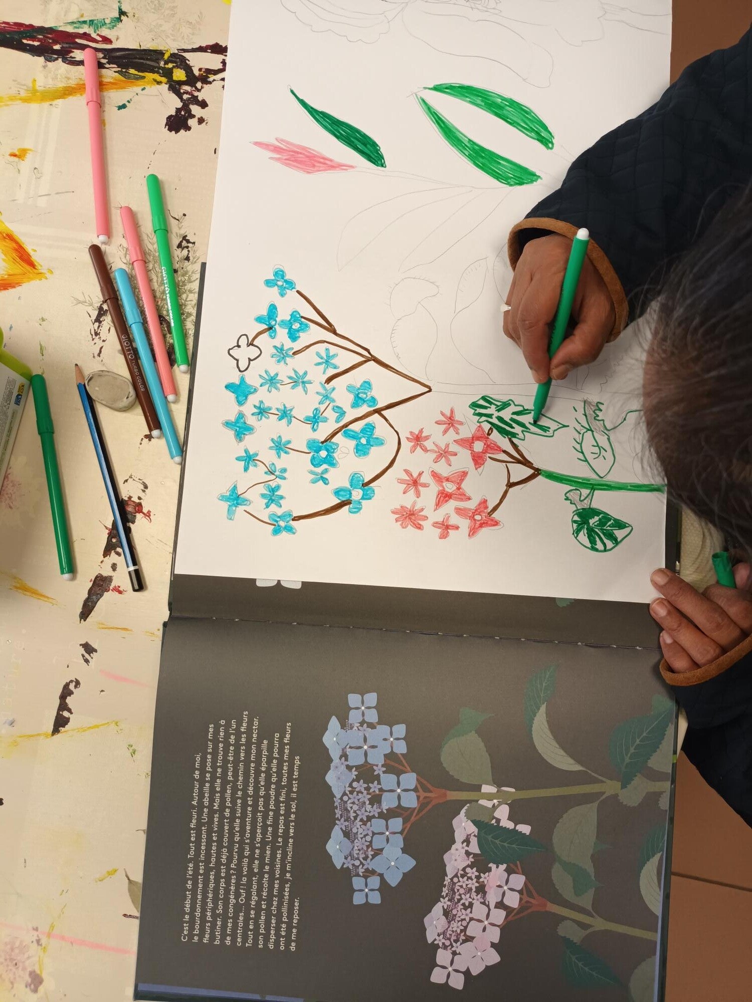 Sylvie Park travaille aussi entant que bibliothécaire à l‘école coréenne de Paris et depuis 2021 elle accompagne en illustration- thérapie, les résidents à la fondation Dr Falret et les enfants de l’ITEP occasionnellement.